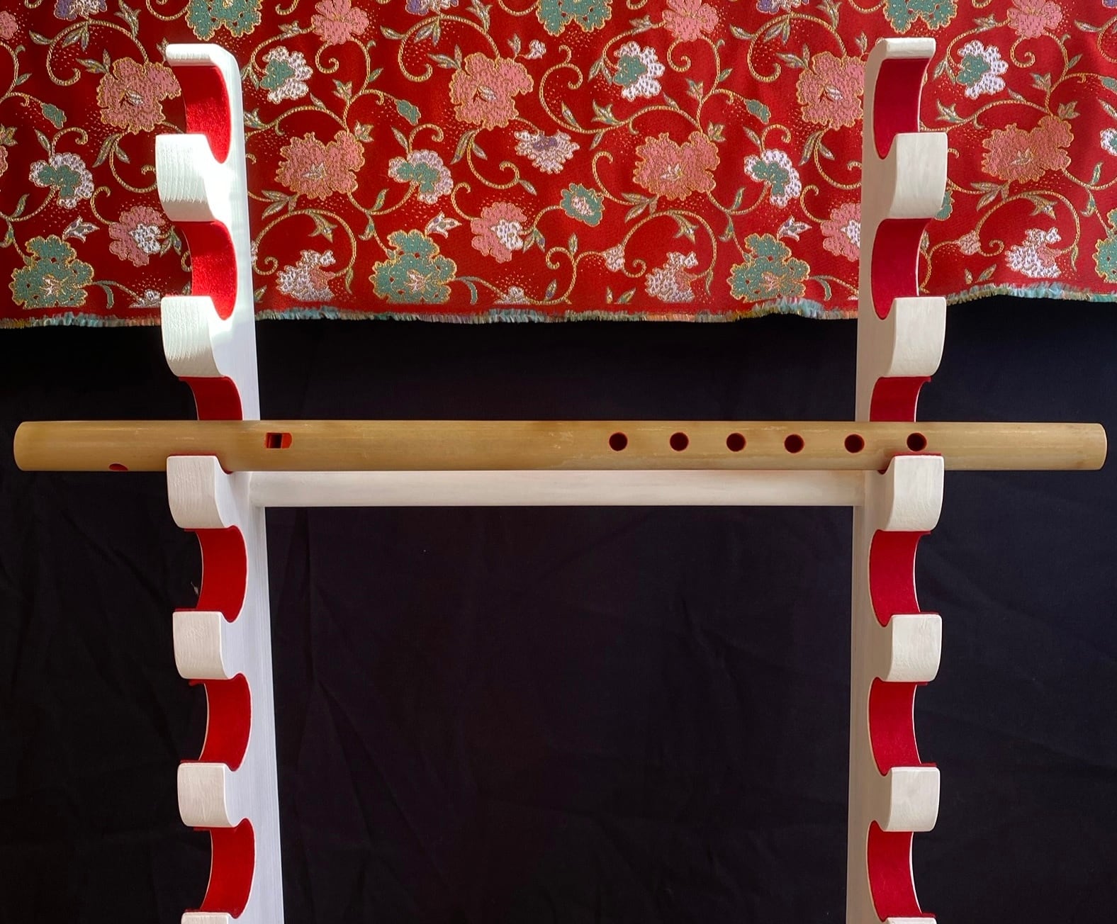 激しいテンポのお囃子にも追従していくため、従来の神楽笛(篠笛)を改良し、どなたでも軽く息を吹き込むだけで音色が出せるようになった神楽笛です。くわえて息を吹き込むだけで音色が出せることから、別名くわえ笛とも言われています。